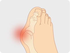 엄지발가락이 밖으로 휘는 변형으로 점점 심해지며 보행시 통증을 야기.