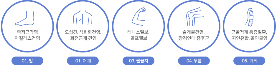 족저근막염, 아킬레스건염, 오십견 등 근골격계 통증 질환에 우수한 치료효과가 있습니다.