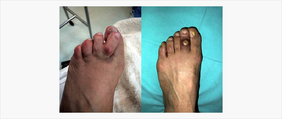 작은 발가락의 변형이 장기화되면 굴곡의 정도는 더욱 심해지고 결국은 굴곡된 관절이 신발의 가죽에 눌려 굳은살이 생기고 통증으로 이어집니다. 더욱 진행이 되면 굳은살에 궤양이 발생하면서 염증이 생깁니다. 발가락에 이런 변형을 예방하기 위해서는 자기 발에 맞는 신발의 선택이 중요합니다. 특히 앞 코에 해당되는 부위가 크고 둥근 신발이 좋습니다. 이런 편한 신발을 착용해도 계속적으로 통증이 있는 경우 발가락의 교정(수술)이 필요합니다. 교정은 변형된 부위와 변형 정도에 따라 여러가지가 있다. 보통 많이 하는 수술은 절제 성형술, 건 절단술, 건 연장술 등이 있다. 비교적 간단하고 수술시간도 짧으며 대부분 좋은 결과를 보입니다.